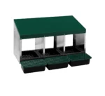 Cuibar MG-03 PROFI cu 3 compartimente poate fi amplasat atât pe podea, cât și montat pe perete. Acoperișul său înclinat împiedică găinile să se urce și să murdărească zona, menținând spațiul de ouat curat. Designul inteligent cu rulare a ouălor protejează ouăle de spargere sau contaminare, deoarece acestea sunt colectate într-o tavă separată imediat după ouat.