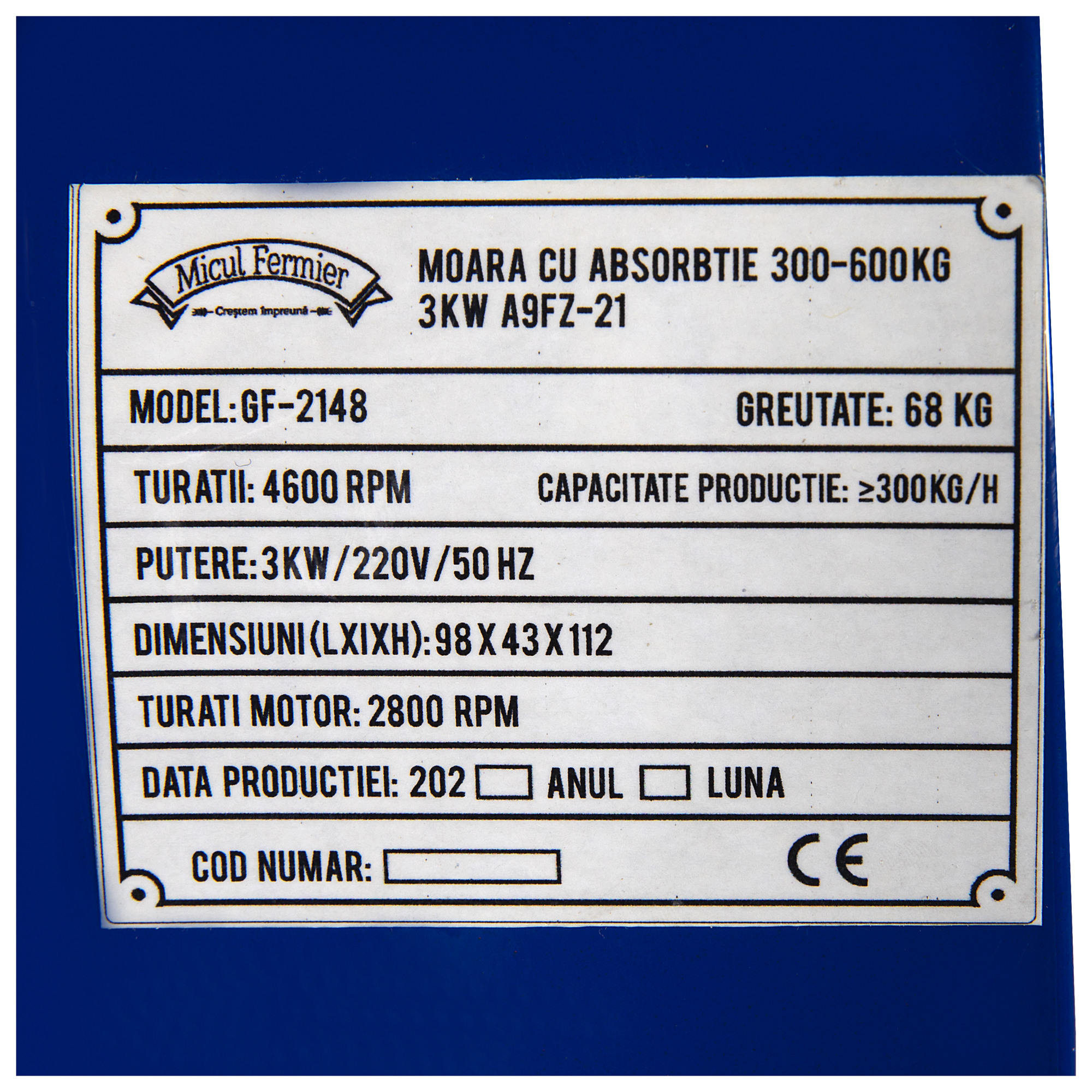 Moara cu absortie 300-600kg 3KW A9FZ-21 Micul Fermier GF-2148 este un produs de uz gospodaresc pentru macinarea boabelor de cereale (grau, porumb, orz, secara, etc.), de oleaginoase (srot de floarea soarelui, soia, rapita, etc.), leguminoase(fasole, usturoi, etc.) si amestecuri ale acestora, in scopul obtinerii de faina furajera necesara hranirii animalelor din micile ferme individuale.